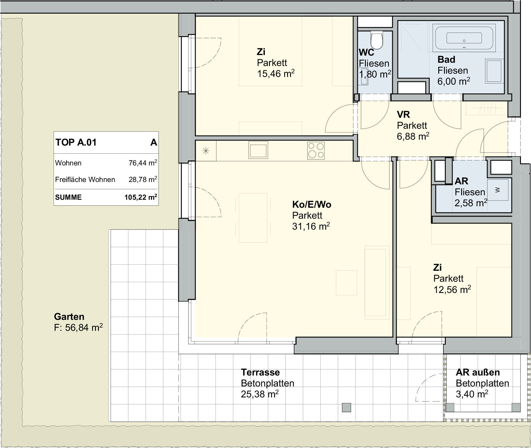 Ein eigener Garten muss kein Traum bleiben. Das Schlossquartier macht diesen Traum auch für Wohnungsbesitzer greifbar. Die Eisenstädter Wohnanlage bietet 12 Wohnungen, die über einen eigenen Garten verfügen, der je nach Wohnung von 12 bis 120 m² umfasst. Der Garten ist nicht nur optischer Aufputz, sondern insbesondere während der wärmeren Jahreszeiten eine echte Erweiterung des Wohnraums. Ein grünes Refugium – ideal, um an der frischen Luft einfach mal durchzuatmen und sich zu entspannen. Natürlich können Sie hier auch an lauen Sommernächten bestens den Abend mit Freunden genießen und gemeinsam mit einem Gläschen Blaufränkisch anstoßen.